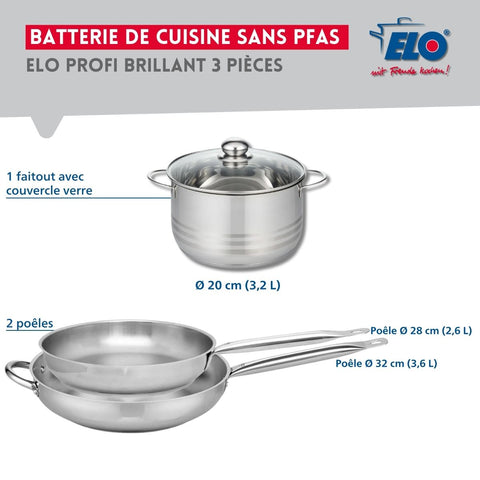 Ensemble de 2 Poêles de cuisson 28 et 32 cm et 1 faitout 20 cm Elo Profi Brillant