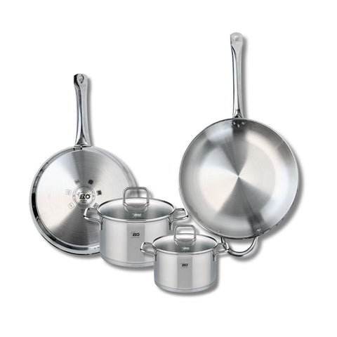Découvrez l'ensemble de cuisson Elo Profi Citrin, une batterie de cuisine complète composée de deux poêles et de deux faitouts, alliant élégance et fonctionnalité.