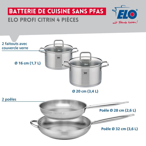 Découvrez l'ensemble de 2 poêles de cuisson de 28 et 32 cm ainsi que 2 faitouts de 16 et 20 cm de la collection Elo Profi Citrin. Fabriqués en inox robuste, ces ustensiles sont conçus pour un usage sur tous types de feux, y compris l'induction. Les poêles Profi Therm garantissent une répartition uniforme de la chaleur, tandis que les faitouts, sans revêtement ni PFAS, assurent une cuisson saine et efficace. Idéaux pour tous vos plats, cet ensemble est un incontournable pour votre cuisine.