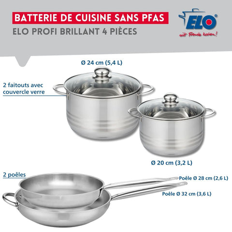 Ensemble de 2 Poêles de cuisson 28 et 32 cm et 2 faitouts 20 et 24 cm Elo Profi Brillant