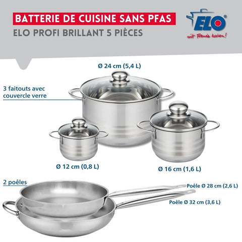 Ensemble de 2 Poêles de cuisson 28 et 32 cm et 3 faitouts 12, 16 et 24 cm Elo Profi Brillant