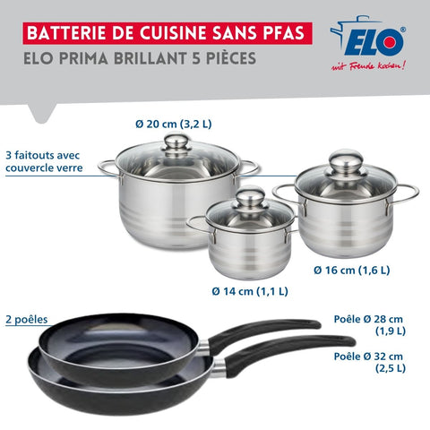 Ensemble de 2 Poêles de cuisson 28 et 32 cm et 3 faitouts 14, 16 et 20 cm Elo Prima Brillant