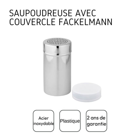 Lot de 2 saupoudreuses de cuisine Fackelmann de 13 cm en inox. Idéales pour saupoudrer sucre glace, cacao ou assaisonner vos plats avec un couvercle hermétique.