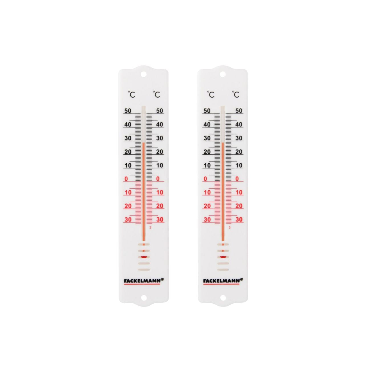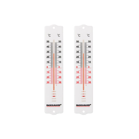 Lot de 2 thermomètres muraux Fackelmann, idéaux pour mesurer la température intérieure et extérieure. Fabriqués en plastique, chaque thermomètre mesure 21 cm de haut et a une amplitude thermique de -30°C à +50°C.