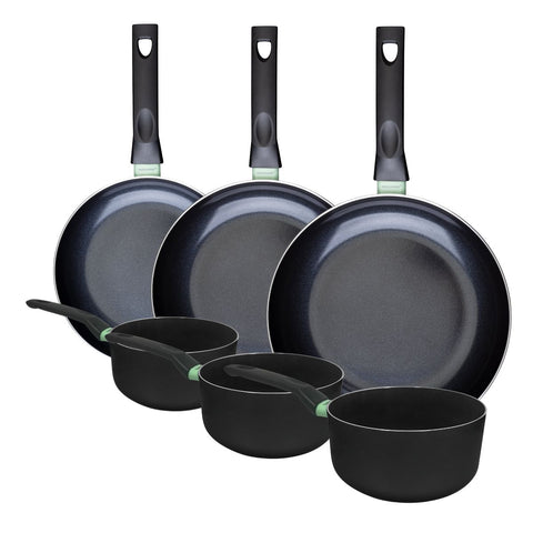 Découvrez cet ensemble Fackelmann Brandao comprenant 3 poêles (24, 28, 30 cm) et 3 casseroles (16, 18, 20 cm) en aluminium recyclé avec revêtement céramique antiadhésif sans PFAS, idéales pour tous feux et résistantes au four jusqu'à 150°C.
