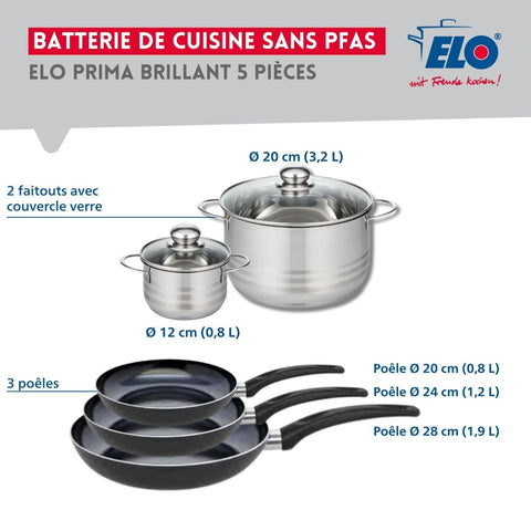 Ensemble de 3 Poêles de cuisson 20, 24 et 28 cm et 2 faitouts 12 et 20 cm Elo Prima Brillant