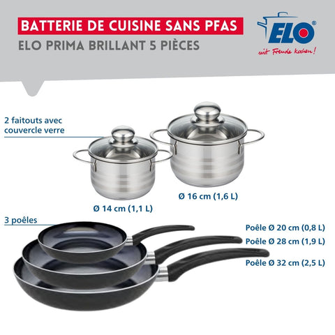 Ensemble de 3 Poêles de cuisson 20, 28 et 32 cm et 2 faitouts 14 et 16 cm Elo Prima Brillant