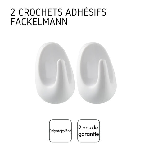Lot de 4 crochets adhésifs Fackelmann, idéaux pour suspendre torchons et serviettes sans percer. Dimensions : 5 cm, en plastique blanc, parfaits pour cuisine ou salle de bains.