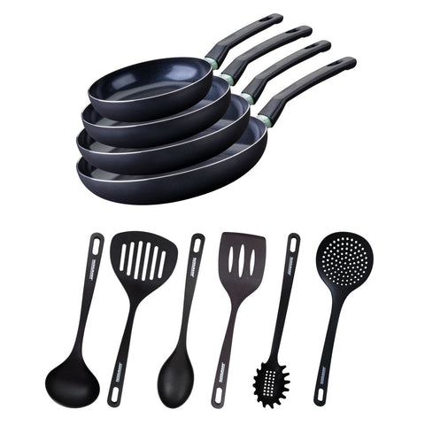 Découvrez notre batterie de cuisine Fackelmann Brandao comprenant des poêles de 20 à 30 cm en aluminium recyclé avec revêtement céramique antiadhésif sans PFAS, ainsi que 6 ustensiles Fenix en RPET.