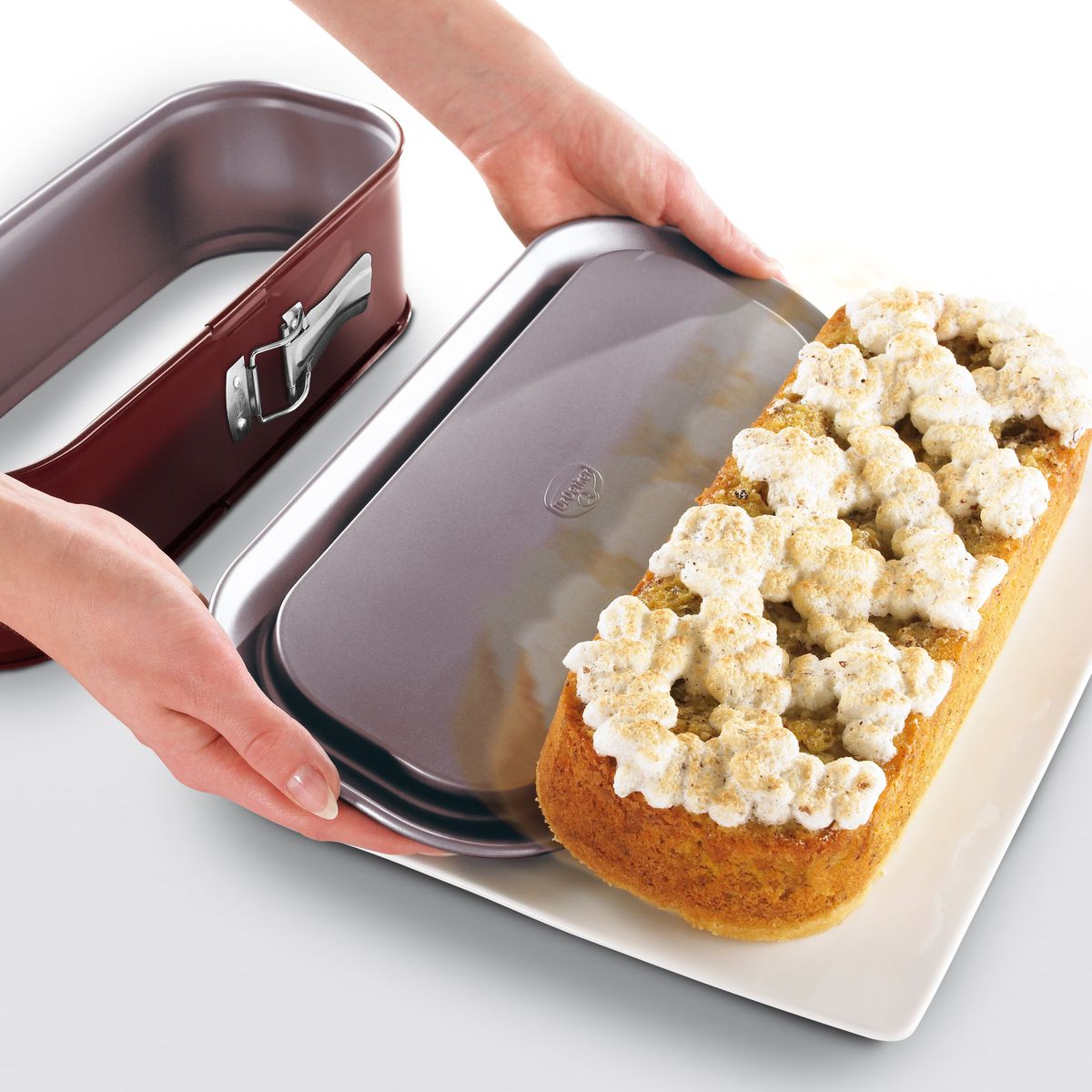 Dr. Oetker vous propose ce lot de 2 moules à cakes bicolores, bordeaux à l'extérieur et argenté à l'intérieur pour tous vos gâteaux rectangulaires. Vos cakes sucrés ou salés, vos brioches, marbrés ou quatre-quarts seront désormais aussi simples à cuire qu'à servir. L'expertise Dr. Oetker est encore une fois mise en avant par l'impressionnante conductivité du moule à charnière, par ses propriétés antiadhésives et par son étanchéité. La charnière du moule à cake Dr. Oetker vous facilite le démoulage et le fond du moule vous permet de servir élégamment votre gâteau.