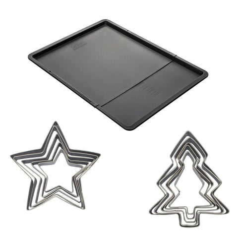 Fackelmann propose cet ensemble avec plaque à pâtisserie extensible et 2 lots de 5 emporte-pièces chacun aux motifs d'étoiles et sapins de tailles différentes.