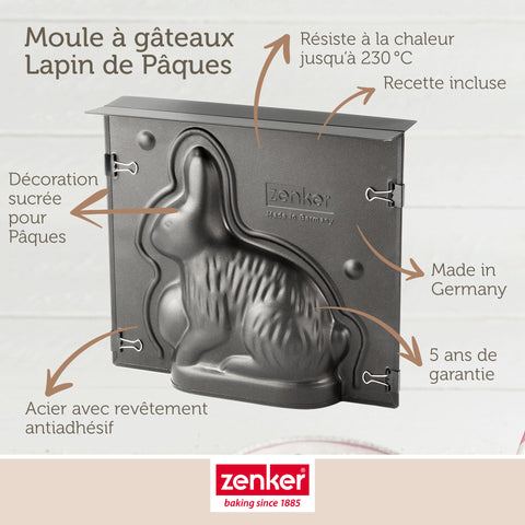 Zenker vous propose cet ensemble de pâtisserie sur le thème de Pâques composé d'un moule à gâteaux 3D en forme de lapin de Pâques de type lammele ainsi que de 5 emporte-pièces en forme de lapin également. Ces ustensiles de pâtisserie sont parfaits pour réaliser des petits sablés lors de la fête de Pâques ou pour l'anniversaire d'un enfant. Le moule à lamala est quant à lui adapté à la cuisson d'une génoise pour Pâques, il s'agit d'une tradition alsacienne encore perpétuée qui ravit les papilles des petits et des grand.