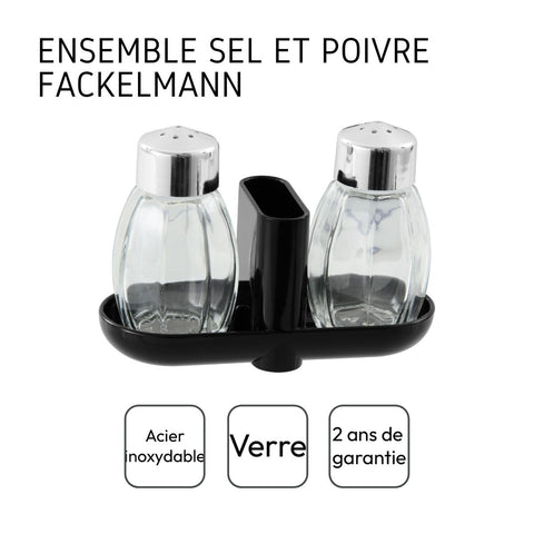 L'ensemble salière et poivrière de Fackelmann est particulièrement adapté pour vos repas. Cet ensemble contient donc une salière, un poivrier et un support avec un compartiment pour y mettre des cure-dents.