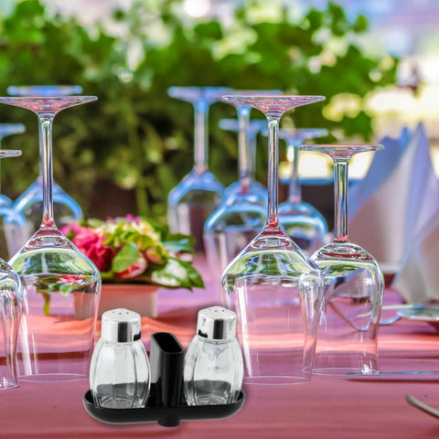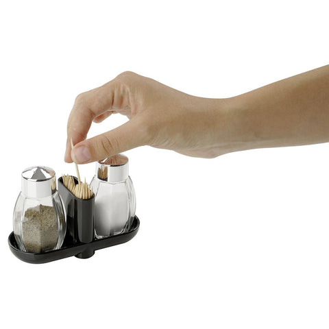 Cet ensemble pour sel et poivre et pratique à poser directement sur votre table. Vous pouvez également mettre des cure-dents dans le compartiment au milieu ou bien de sauces en sachet comme du ketchup, de la mayonnaise ou de la moutarde.