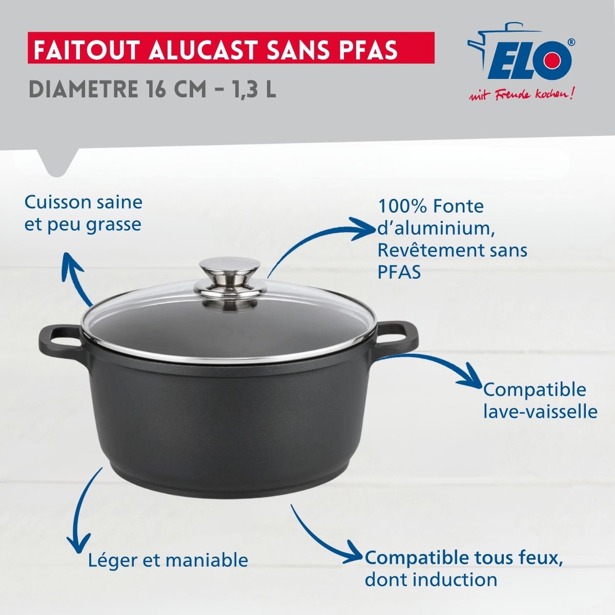 Elo vous propose ce faitout à induction de 16 cm de diamètre sans PFAS avec son couvercle en verre. Dans ce faitout vous pourrez cuisiner toutes les recettes y compris les plats en sauce, les pâtes, les légumes, les soupes... Notre marmite à induction passe sur tous les feux, y compris le four.