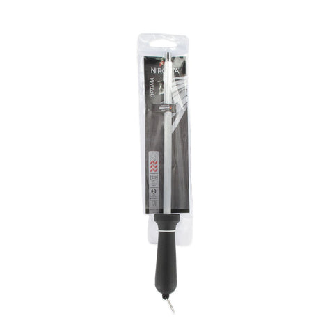 Le fusil à aiguiser Nirosta Optima est doté d'un aiguiseur aimanté en acier inoxydable d'une longueur de 20 cm (longueur totale 30,5 cm). La poignée en plastique noir tient confortablement dans la main et dispose d'une boucle de suspension pratique.