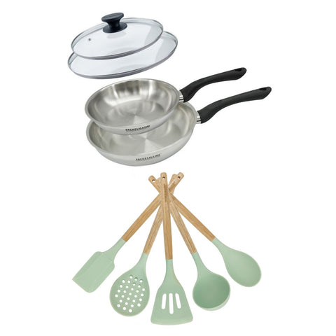 Optimisez votre cuisine avec cet ensemble Fackelmann comprenant deux poêles en inox de la collection Geneva, accompagnées de 7 ustensiles pratiques et de couvercles en verre pour une cuisson maîtrisée.
