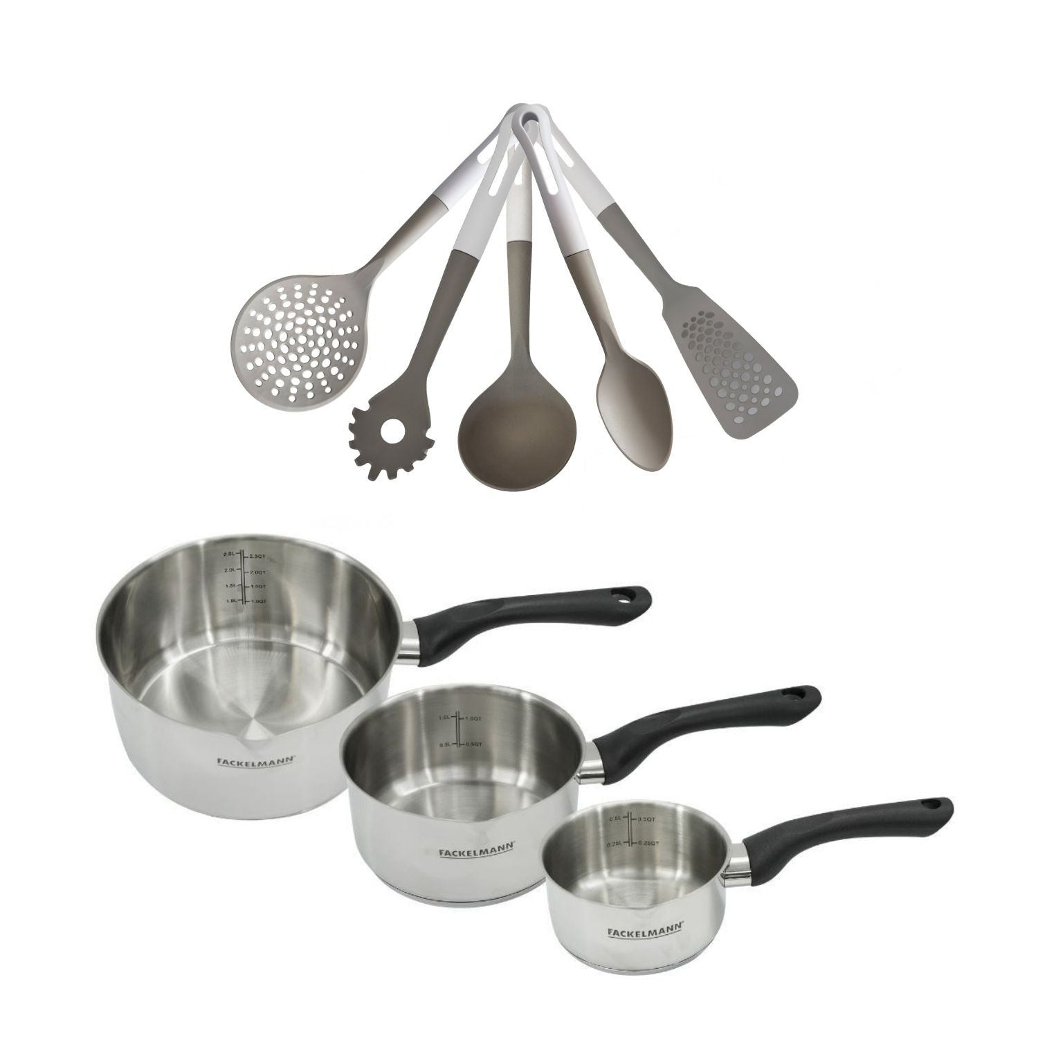 Découvrez le lot Fackelmann avec 3 casseroles en inox Geneva et 5 ustensiles pour une cuisine polyvalente et élégante.