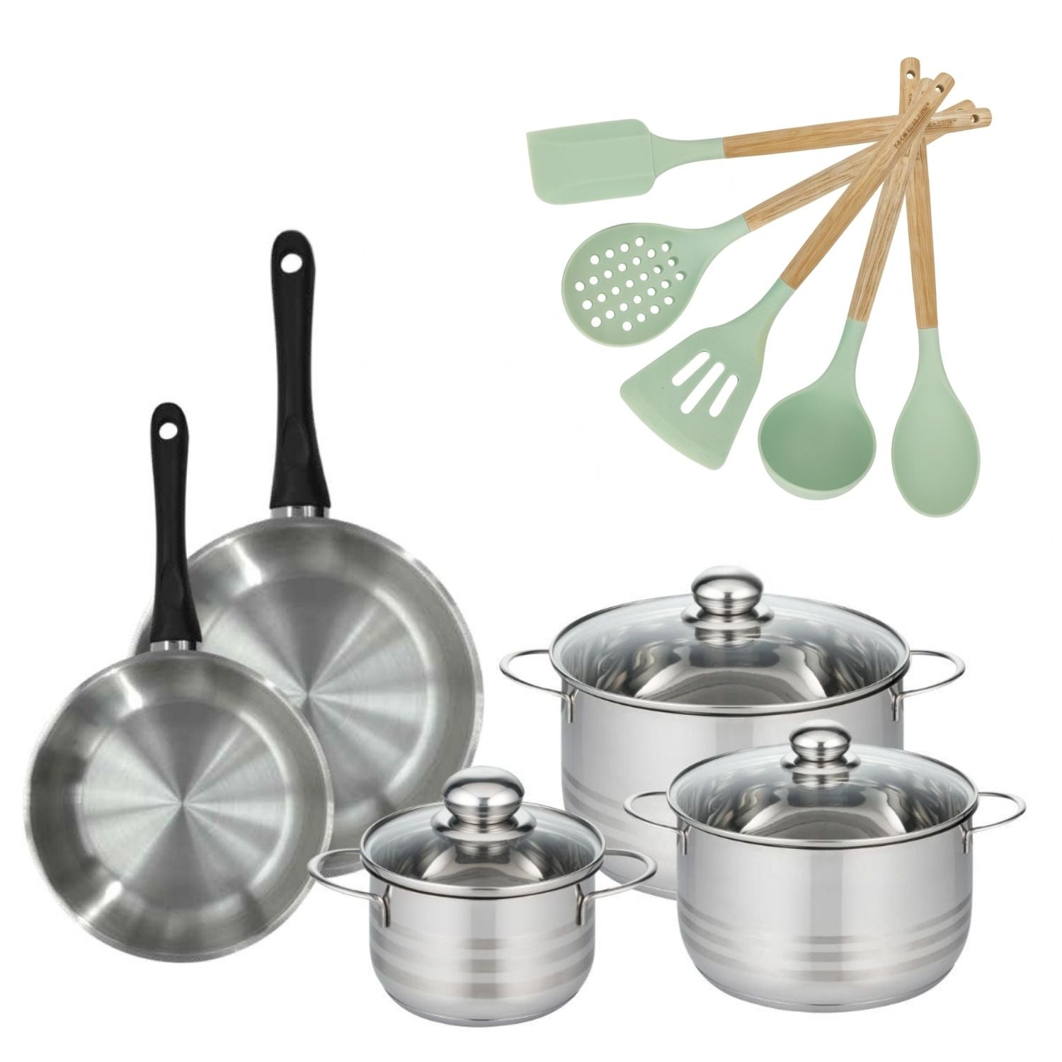 Découvrez notre ensemble complet comprenant 3 faitouts en inox et 2 poêles Fackelmann Généva, accompagnés de 5 ustensiles de cuisine pour une expérience culinaire optimale.