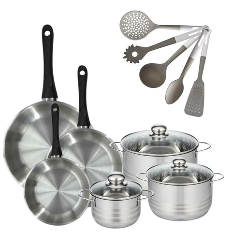 Découvrez cet ensemble complet de cuisine avec 3 poêles en inox Fackelmann Geneva et 3 faitouts, accompagnés de 5 ustensiles pratiques. Idéal pour une cuisine polyvalente et efficace.