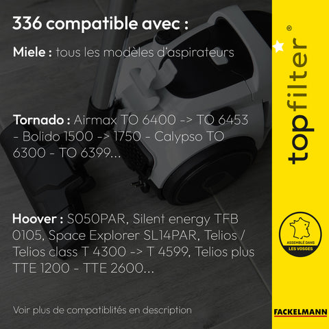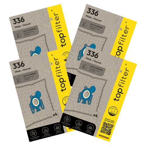 TopFilter, fabricant français de sacs d'aspirateurs, propose ce lot de 4 packs de 4 sacs aspirateur Miele et Hoover, soit 16 sacs. Le sac aspirateur doit être changé dès qu'il est rempli soit environ tous les 4 mois.