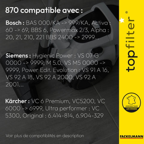 Les sacs aspirateur TopFilter multicouches en non-tissé (100% synthétique) sont fabriqués et conditionnés en France. Ils sont équipés d’une plastiquette nouvelle génération avec un joint en caoutchouc et une fermeture hygiénique pour une haute capacité de filtration et une étanchéité sans défaut.