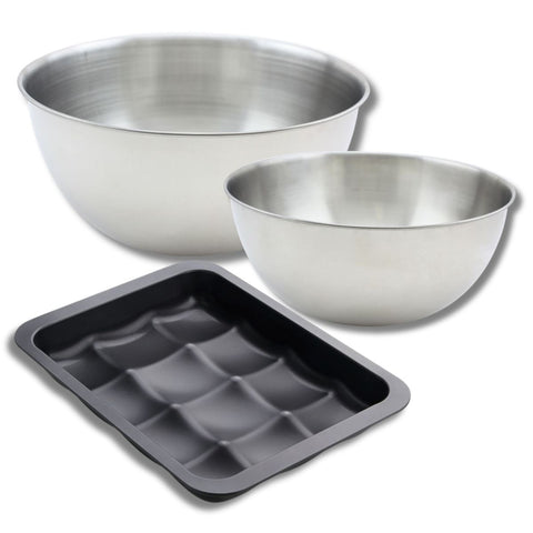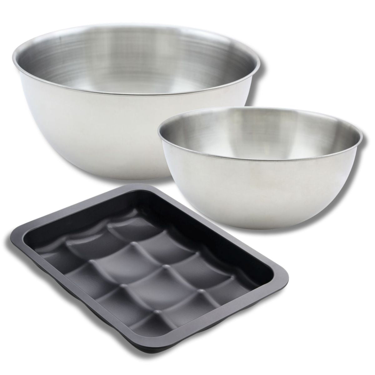 Découvrez ce lot d'ustensiles de cuisine comprenant un moule à 12 mini pains Zenker, deux bols à mixer en inox de Fackelmann et une spatule en silicone. Parfaits pour toutes vos créations culinaires !