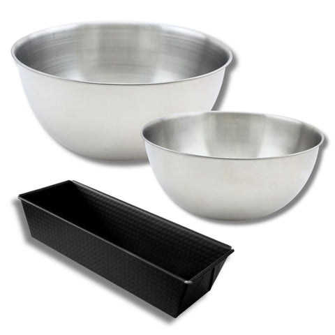 Découvrez notre ensemble de cuisine comprenant un moule à cake de 25,5 cm, deux bols à mixer en inox (25 cm et 20,5 cm) et une spatule en silicone de 25 cm. Idéal pour toutes vos préparations sucrées et salées.