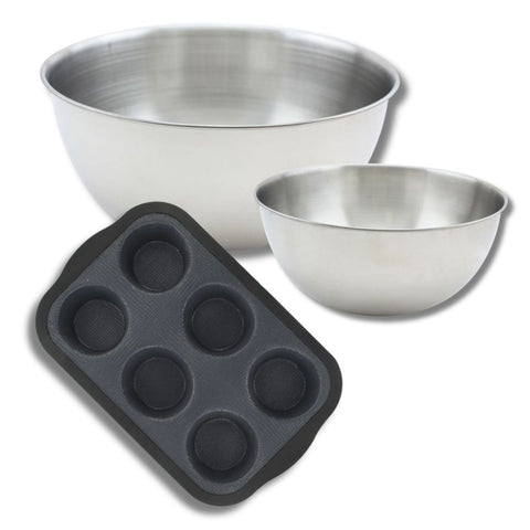 Lot de pâtisserie avec 1 Moule à muffins en silicone fibre de verre, 1 spatule Zenker et 2 bols à mixer en inox Fackelmann