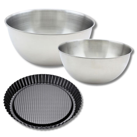 Découvrez notre ensemble de cuisine comprenant un moule à tarte renversée de 28 cm, deux bols à mixer de 25 cm et 20,5 cm en inox, ainsi qu'une spatule de cuisine de 25 cm. Parfait pour toutes vos préparations culinaires !