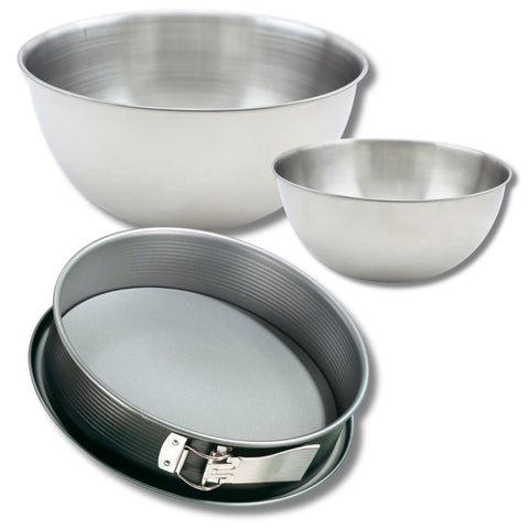 Ce lot comprend un moule à manqué à charnière Zenker de 28 cm, deux bols à mixer en inox Fackelmann de 25 cm et 20,5 cm, et une spatule en silicone Zenker de 25 cm, parfaits pour toutes vos créations pâtissières.