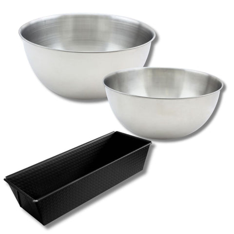 Découvrez notre lot de 4 ustensiles de pâtisserie : un moule à cake Zenker de 25 cm, deux bols à mixer en inox de 25 cm et 20,5 cm, et une spatule de cuisine en silicone de 25 cm. Parfait pour réaliser toutes vos recettes.