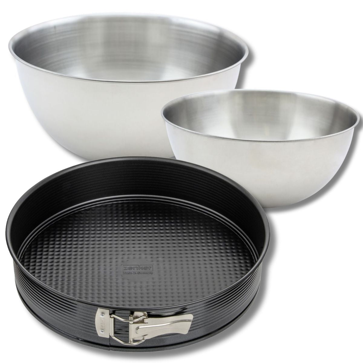 Lot comprenant 1 Moule à manqué 30 cm, 1 spatule Zenker et 2 bols à mixer en inox Fackelmann