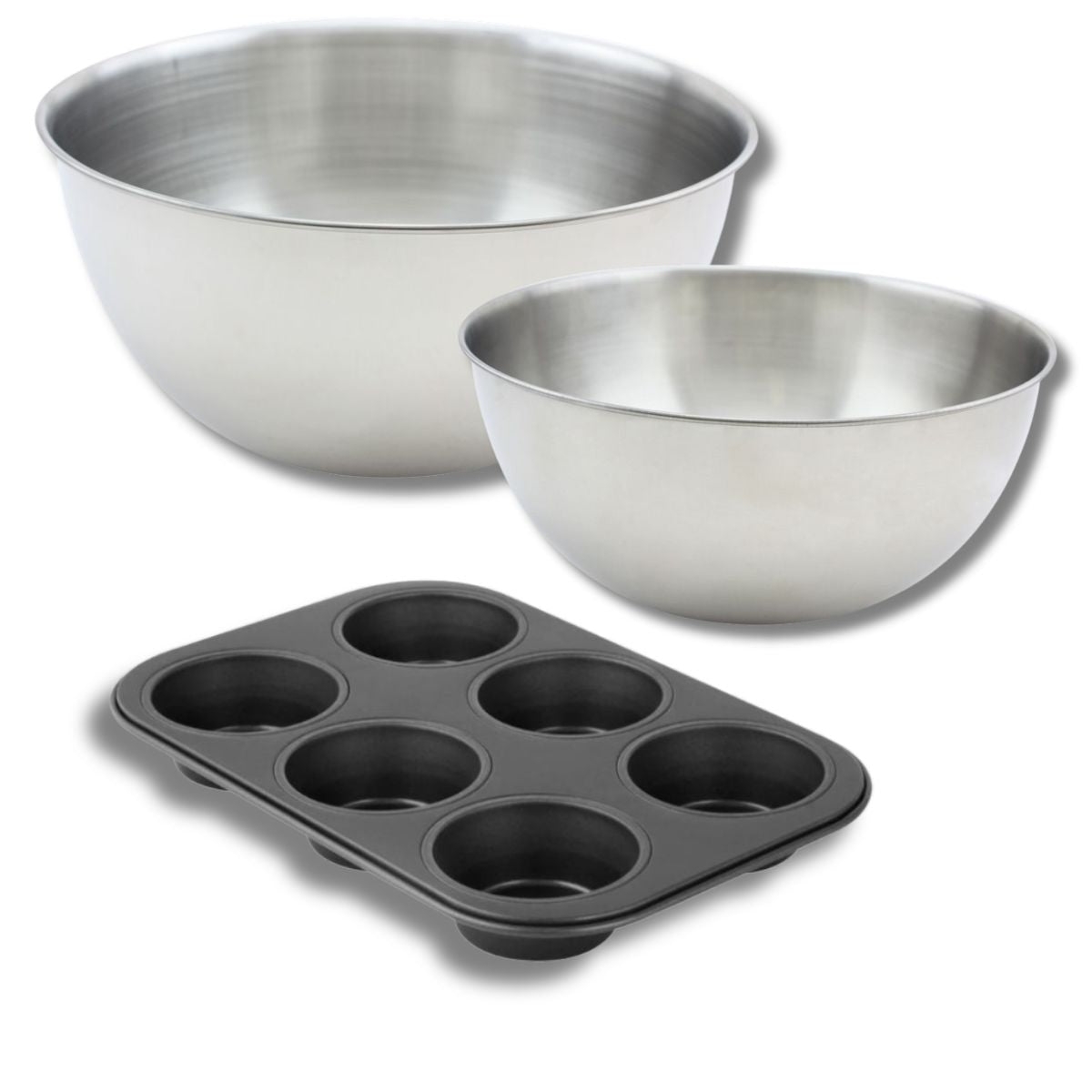Découvrez notre ensemble de pâtisserie comprenant un moule à muffins Zenker, un bol à mixer en inox de 25 cm et un de 20,5 cm de Fackelmann, ainsi qu'une spatule en silicone. Idéal pour vos créations culinaires.