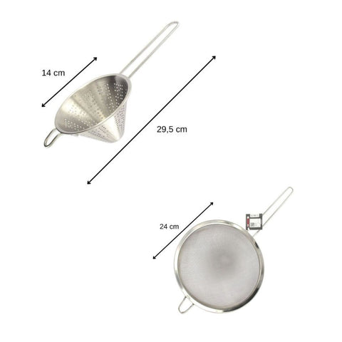 FM Professional vous propose cet ensemble, chinois conique en acier inoxydable de 14 cm et passoire en inox de 24 cm, idéale pour tamiser et filtrer confitures, jus de fruits et coulis, assurant une texture lisse et homogène.