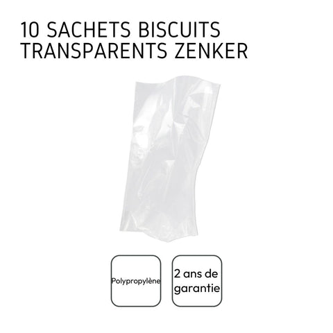 Zenker vous propose ce lot de 10 sachets biscuits transparents. Dans ces sachets biscuits vous pouvez emballer des biscuits sablés ou des biscuits de noël afin de les offrir.