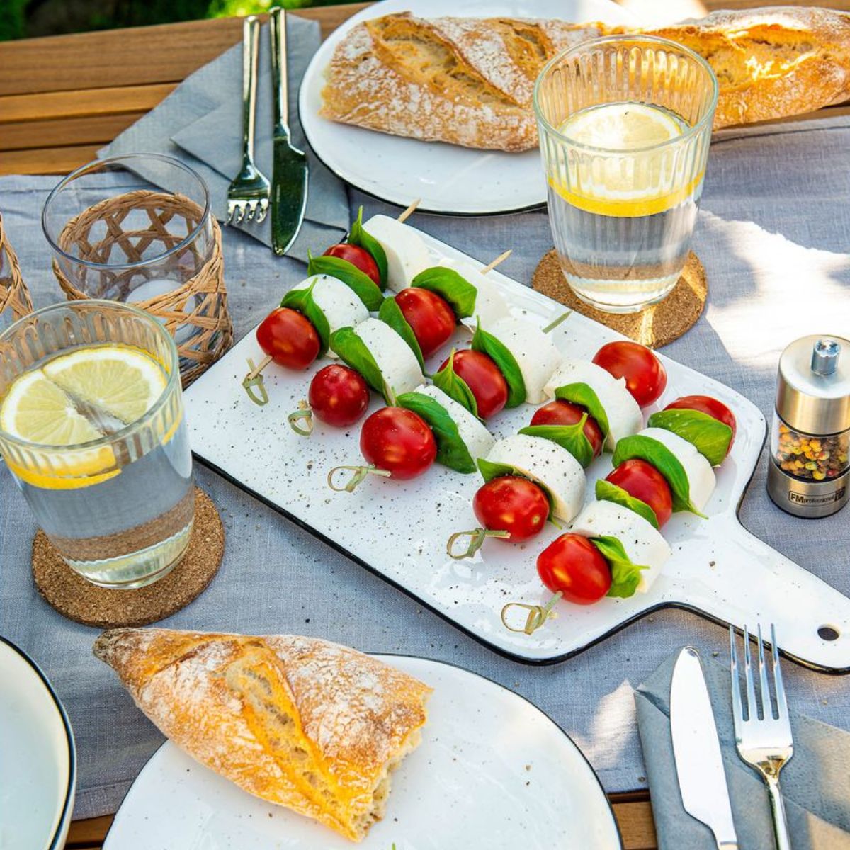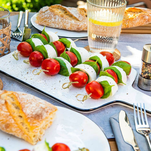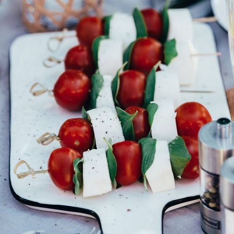 Fackelmann propose ce lot de 100 pics à brochettes en bambou de 10 cm de long. Ces pics à brochette servent à réaliser les brochettes apéritives avec des tomates cerises et des dés de fromage.