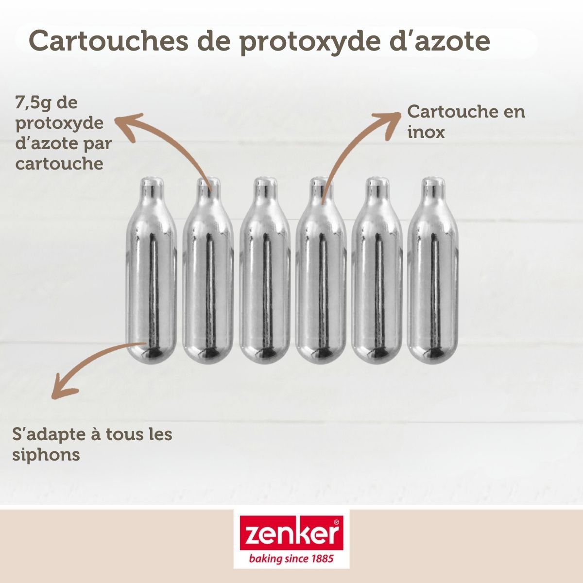 L'ensemble de 12 cartouches de protoxyde d'azote pour siphon à Chantilly, conçu par Zenker, incarne la solution ultime pour savourer des chantilly délectables. Les cartouches sont en acier inoxydable ; chacune mesure 6,5 x 1,7 cm et contient une quantité mesurée de 7,5 grammes de protoxyde d'azote.
