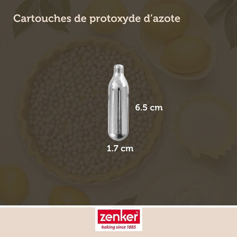 L'ensemble de 12 cartouches de protoxyde d'azote pour siphon à Chantilly, conçu par Zenker, incarne la solution ultime pour savourer des chantilly délectables. Les cartouches sont en acier inoxydable ; chacune mesure 6,5 x 1,7 cm et contient une quantité mesurée de 7,5 grammes de protoxyde d'azote.