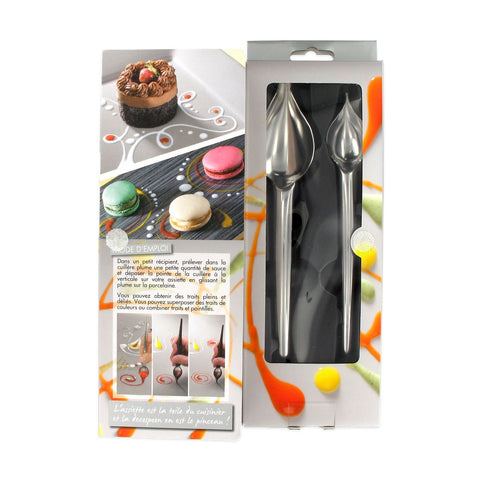 La cuillère plume est brevetée et célèbre dans le milieu de la cuisine. Avec la cuillère plume de décoration vous pourrez transformer une simple assiette en une assiette gourmande et bien décorée. Evidemment, ces cuillères nécessitent un peu d'entrainement et de pratique avant d'être totalement maîtrisées !
