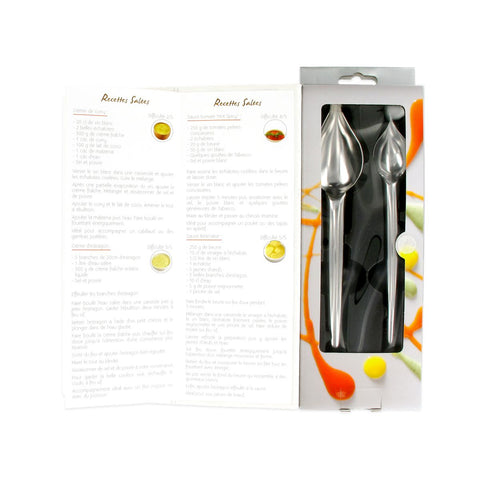 Jean Daudignac vous propose ce coffret de 2 cuillères plumes ou cuillères de décoration. Grâce à la "cuillère plume" vous pourrez décorer vos assiettes salées comme sucrées avec de la sauce de viande, de la vinaigrette, du chocolat, du caramel, du coulis de fruits rouges...