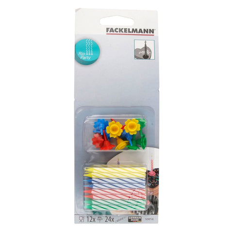 Fackelmann vous propose ce lot de 24 bougies pour gâteau d'anniversaire et ses 12 bobèches assorties pour les planter correctement dans le gâteau. Le lot contient 6 bougies de chaque couleur ! rouge, vert, bleu, jaune.