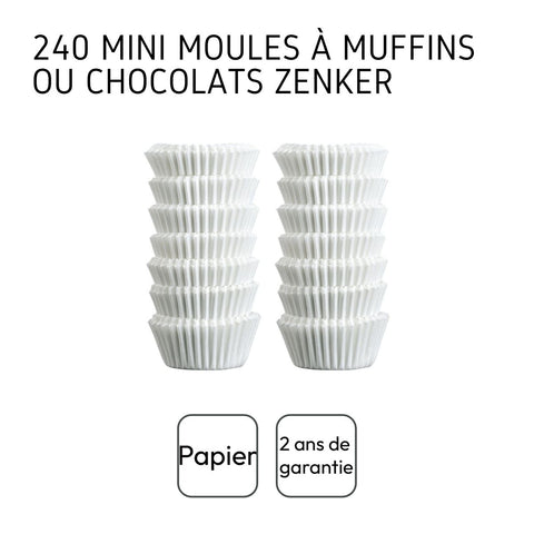 Zenker vous propose cet ensemble de 240 moules à muffins en papier blanc. Ces moules à gâteau de 3 cm de diamètre sont parfaits pour y cuire des petits gâteaux mais aussi y déposer des chocolats, des dattes fourrées de pâte d'amande etc.