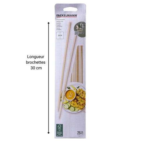 Fackelmann propose ce lot de 25 pics à brochettes en bois mesurant 30 cm de long. Ces pics avec des têtes de lit affûtées pour faciliter l'embrochement serviront à réaliser des brochettes de viande ou de légumes pour le barbecue ou bien de fruits, de fromage, de crudités pour un apéritif.
