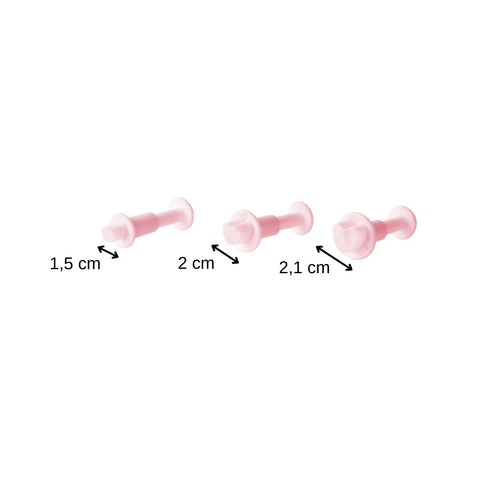 Un emporte-pièce avec poussoir sert à découper la pâte à sucre puis à déposer la forme sur la pâtisserie à décorer. Le poussoir permet d'être précis. Ce set d'emporte-pièce contient trois emporte-pièces cœur de taille différente.