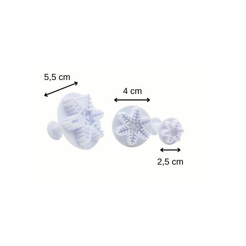 L'emporte-pièce poussoir est un ustensile de pâtisserie et particulièrement de décoration de pâtisseries. En effet, l'emporte-pièce découpe la pâte à sucre et le poussoir aide à déposer la forme sur la pâtisserie à décorer. Ce set est composé de 3 emporte-pièces de Noël de tailles différentes avec le même motif de flocon de neige.
