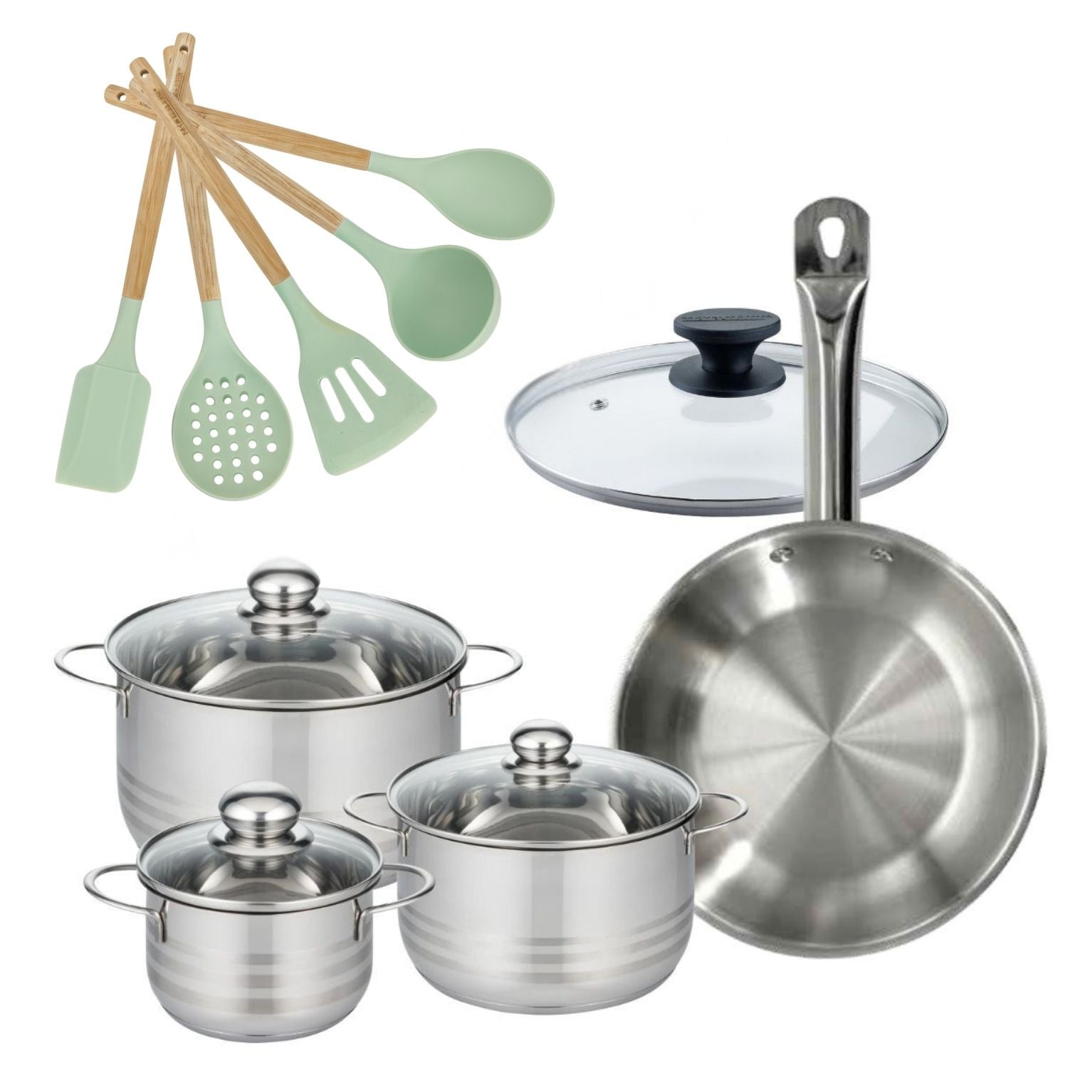Lot de 3 Faitouts 16/20/24cm et 1 Poêle 28cm Fackelmann Etherna avec 5 ustensiles