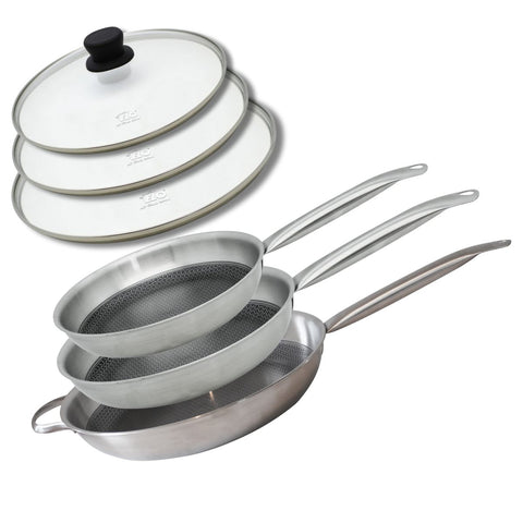 Ce lot comprend trois poêles en acier inoxydable Elo Relief Solutions (24, 28 et 32 cm) et trois couvercles en verre (24, 28 et 32 cm). Tous compatibles avec tous feux et four jusqu'à 240°C, ils offrent un confort et une performance de cuisson optimale.