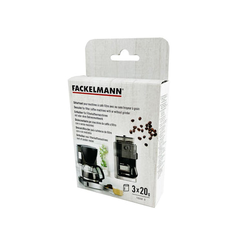 Fackelmann vous propose ce lot de 3 sachets de détartrant pour machines à café avec filtre, avec ou sans broyeur à grains, afin de leur rendre leur propreté initiale. Le détartrant en poudre est facile à utiliser et nettoie notamment le calcaire qui peut bloquer le bon fonctionnement de votre machine à café.