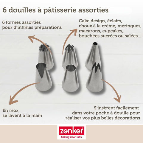 Zenke vous propose ce lot de 6 douilles de pâtisserie en inox aux motifs différents pour réaliser de beaux choux à la crème ou des éclairs étonnants ! Vous pourrez aussi décorer vos gâteaux avec ces douilles inox grand modèle.
